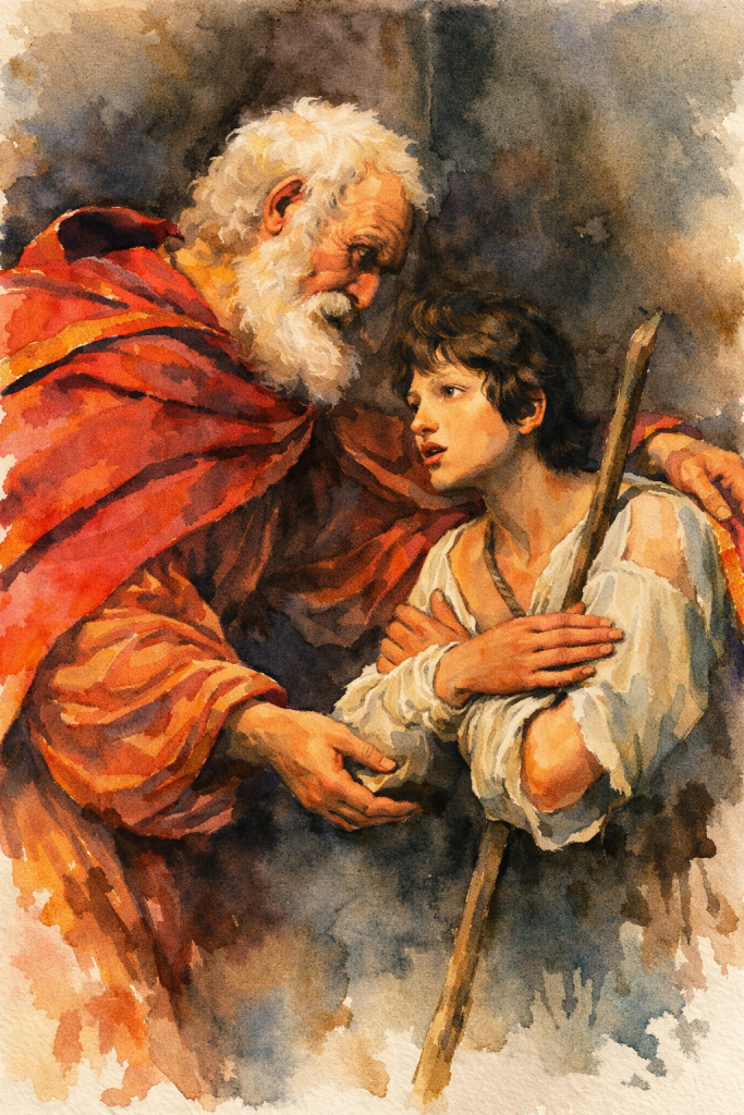 8. RETURN. Imagine the return! Possibly every day the loving and merciful and patient father would climb the hill, cup his eyes, and peer out into the distance with hope upon seeing his lost son. The day finally arrives! However, the father peers into the distance and sees a figure who slightly resembles his son, but even more differs from his son. Approaching the father is a young man ( but appears much older), emaciated, disheveled hair, a long and matted beard, tattered clothes falling from the body, and his gait— not springy– but slow and halting and stumbling! Could this be his son? As the distance closes, the father is convinced that this indeed is his son, transformed, rather deformed due to an unhealthy life.